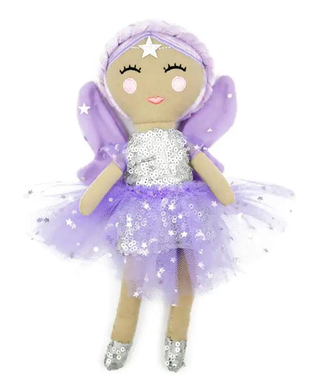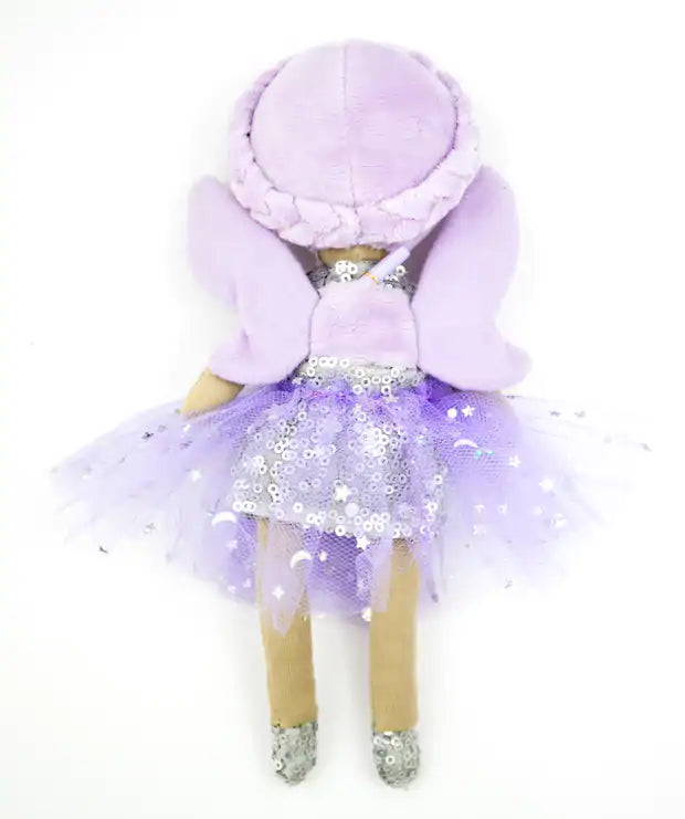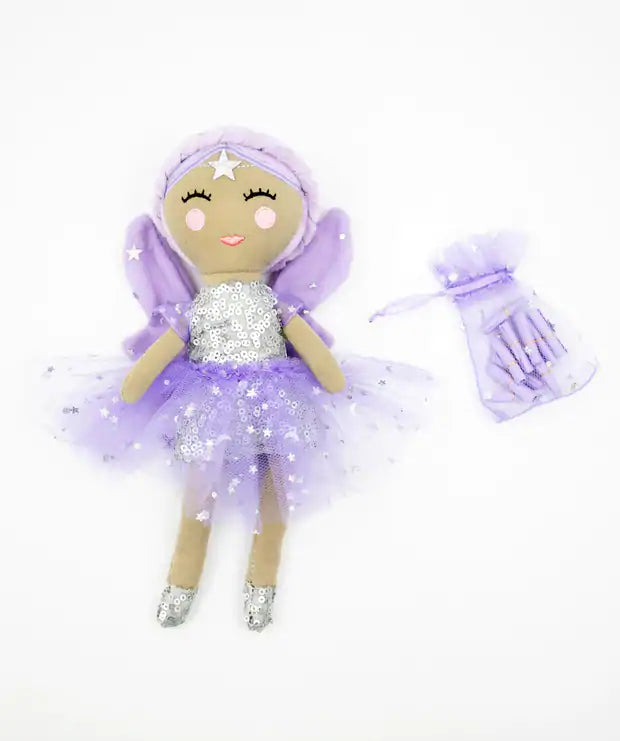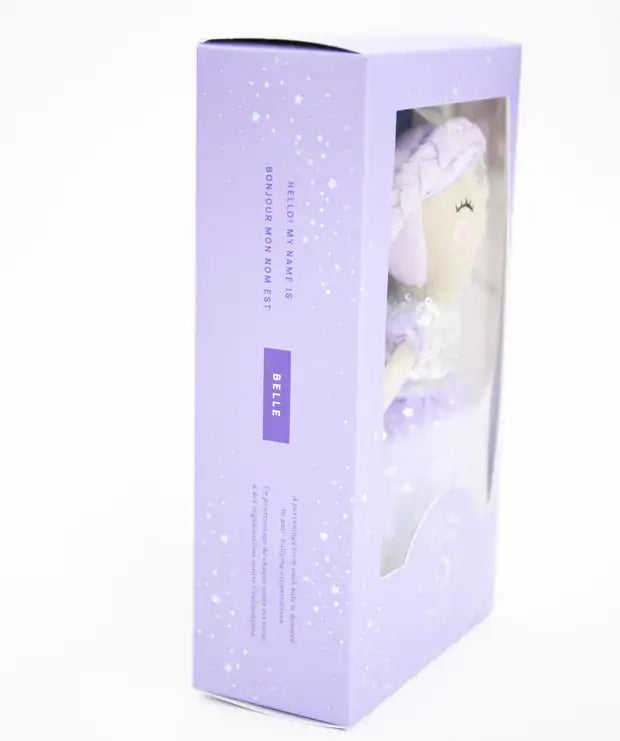Belle the fairy encourages your child to do good deeds. She features a sparkling silver top and a purple tulle skirt adorned with iridescent stars and moons. She has the softest knit fabric body, an on-trend lavender crown braid, and a delicate embroidered face.