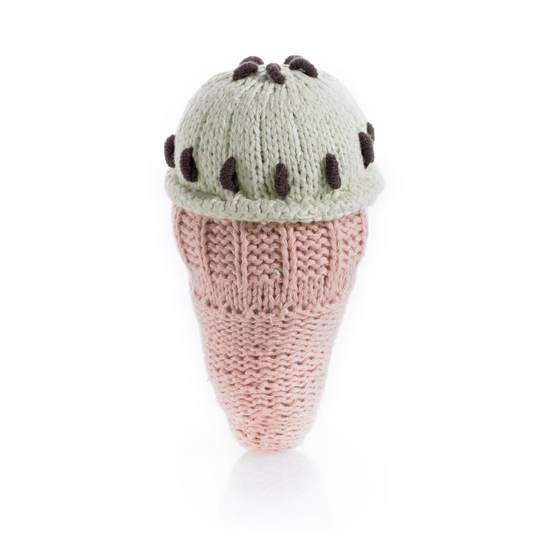 Yummylicious to look at and sweet to play with, our ice cream cone rattle is handmade with soft cotton yarn. Looks like mint chocolate chip ice cream!