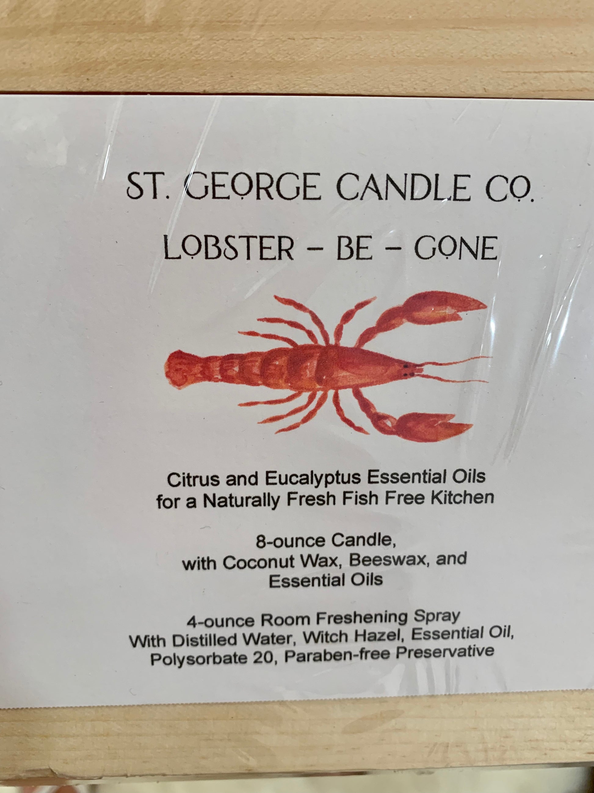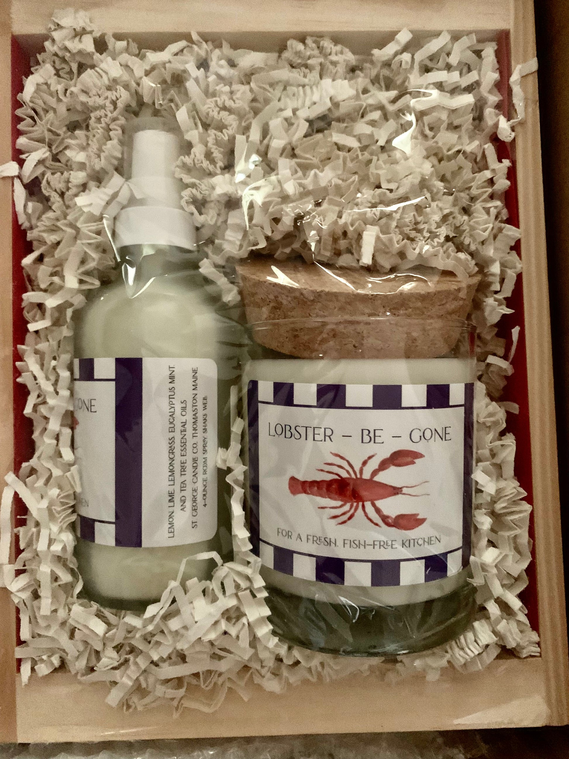- The Lobster Be Gone Gift Set contains an 8 oz. candle with a 4 oz. room spray and comes in a cute wooden crate.