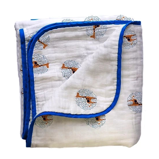 This extra large 4-layer bamboo muslin blanket is white with a cute giraffe design and blue trim.
