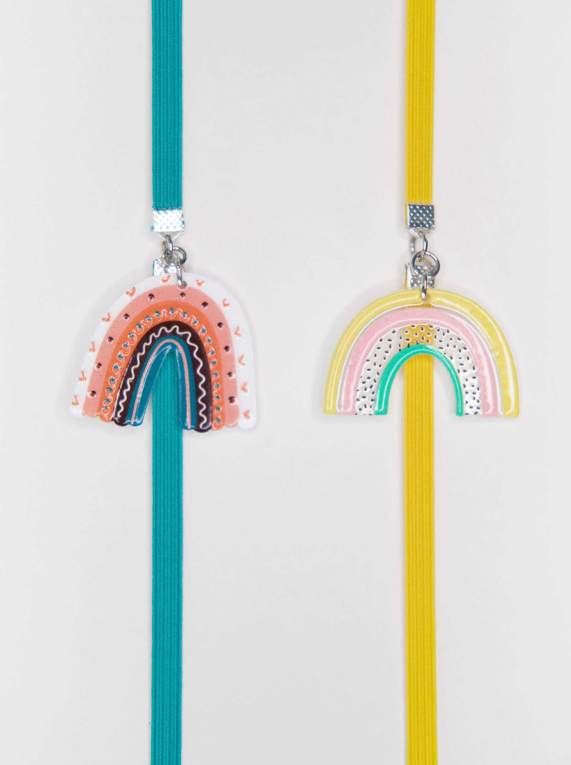 Artmark elastic bookmark in a trendy rainbow - your choice of Yellow or Teal style ribbon. Fitting snugly on nearly any size book, notebook, or planner you can be sure an Artmark will never fall out and lose your place, no matter where you bring your new read.