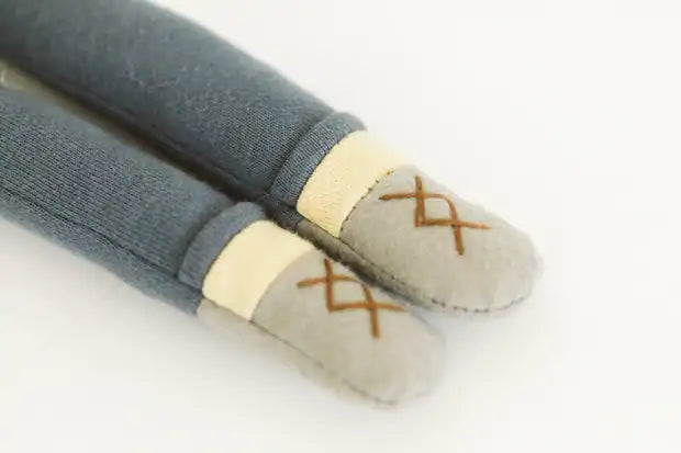 The Hope Doll features a camel brown henley style shirt and denim blue pants that are made from the softest cotton knit fabric. You'll find embroidery detail throughout his outfit. He is made complete with felt gray 'shoes'.