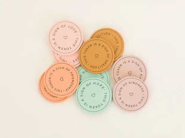 • 10 wooden tokens (MDF) with non-toxic paint in lavender (kindness token), pink (love token), teal (hope token), tan (gratitude token), peach (friendship token).