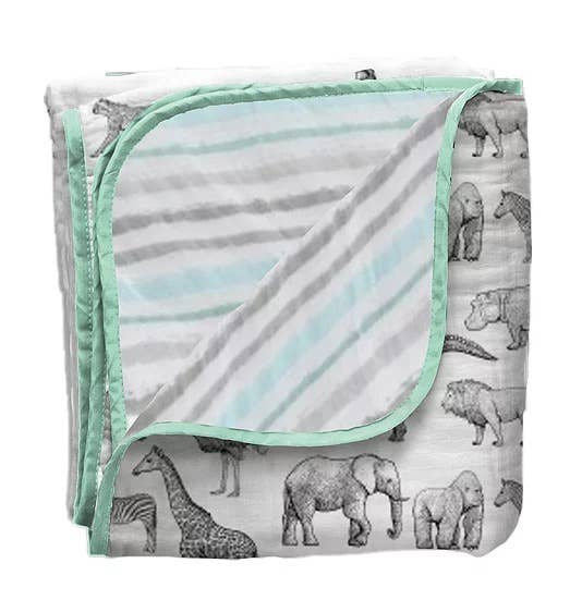 • Safari animals drawn in grayscale reversing to mint and gray stripes. Trimmed in pale green.