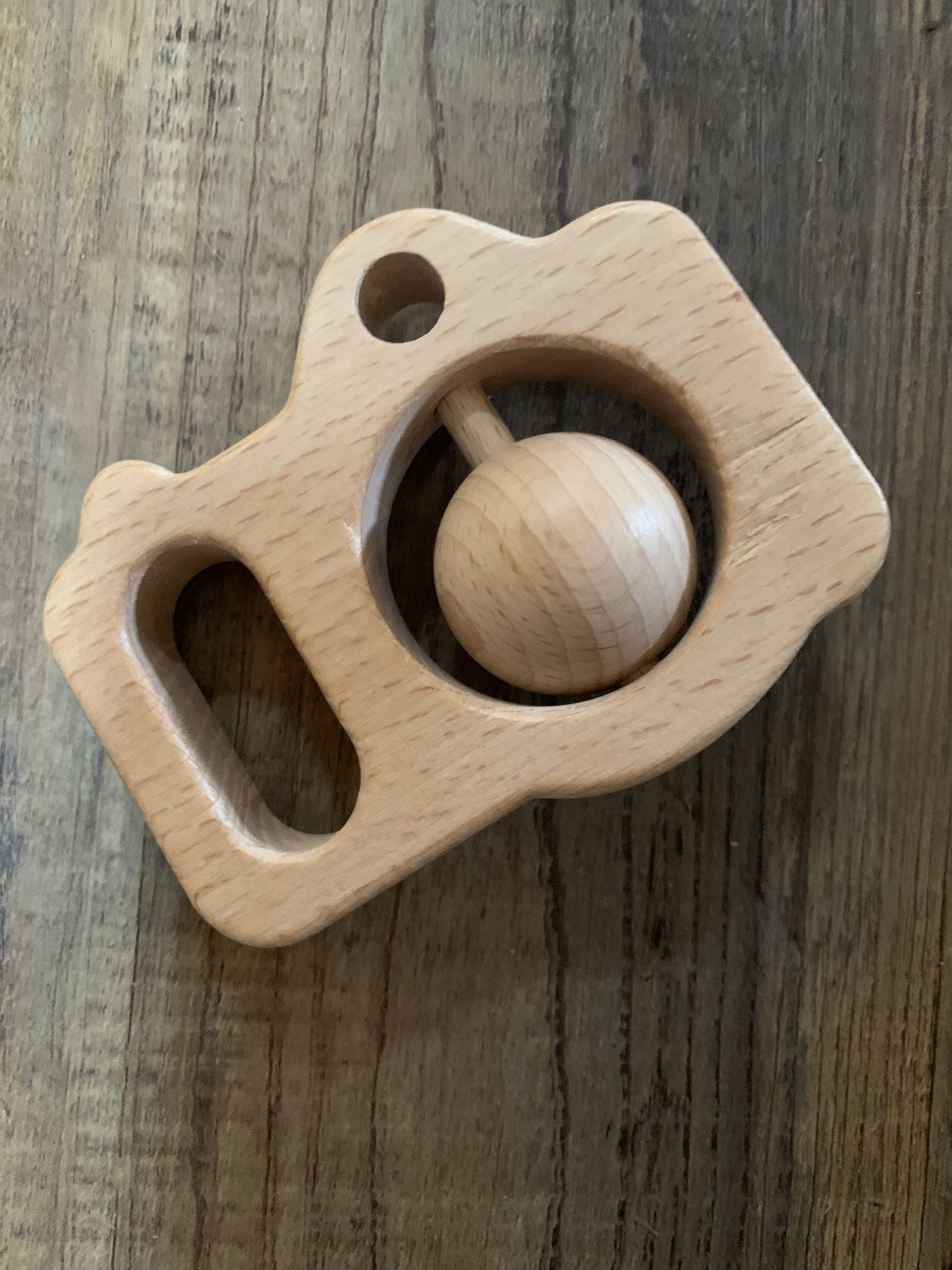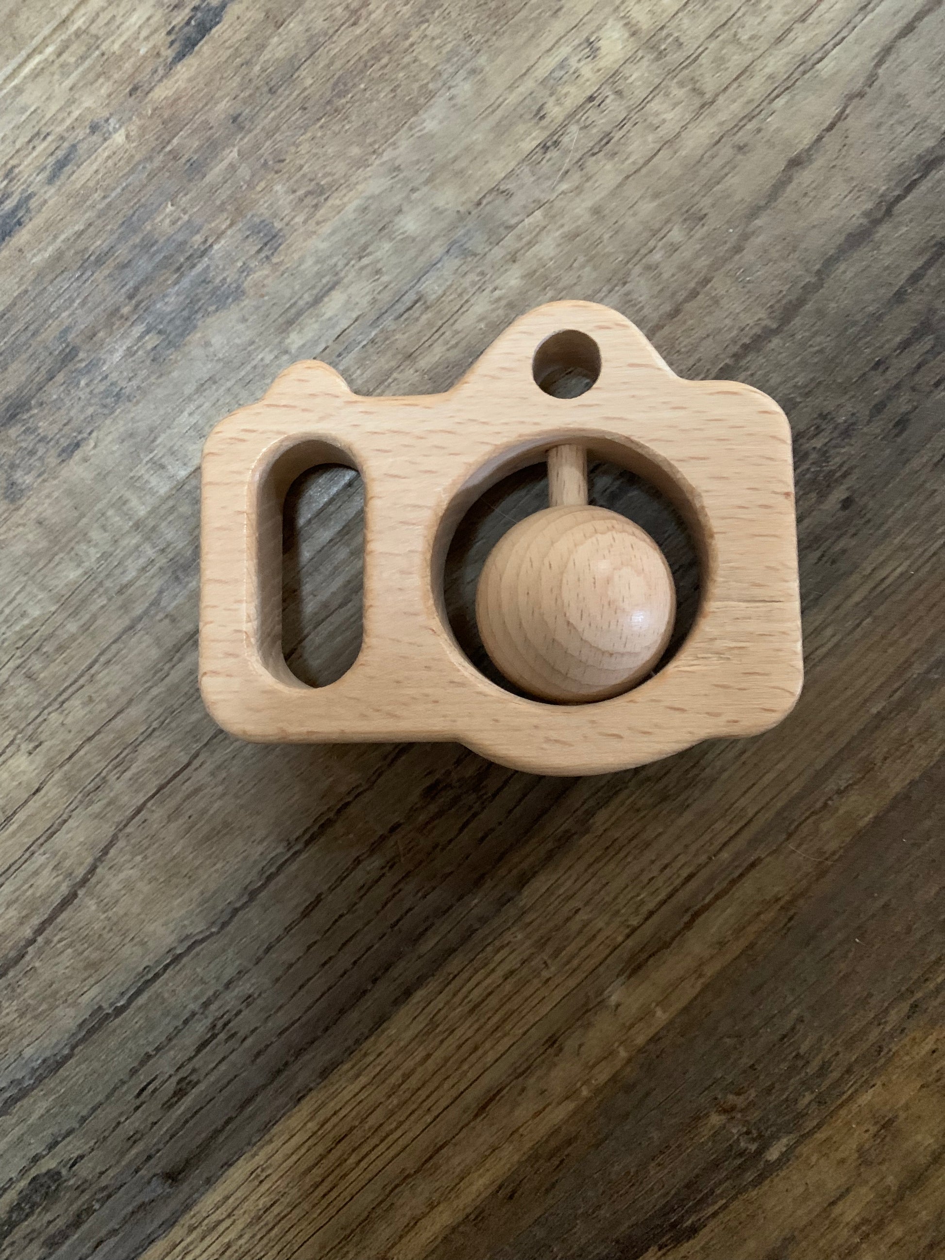 Handmade from beech wood, this cute camera inspired rattle and teething toy is just the right gift for a picture perfect little one.
